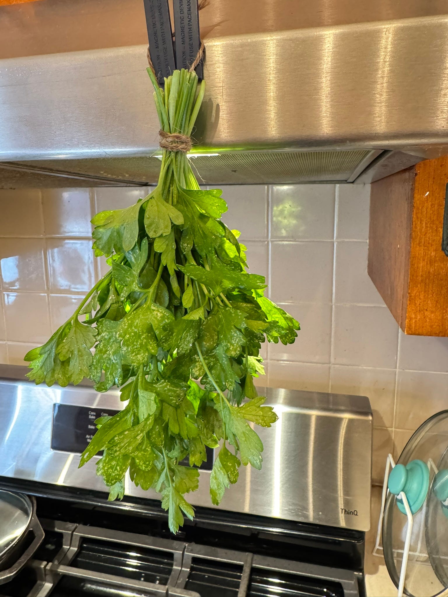 Later, my husband comes inside holding a thick green bunch of flat-leaf parsley. I look up from my studies, blink, and cock my head like a dog, a little confused.